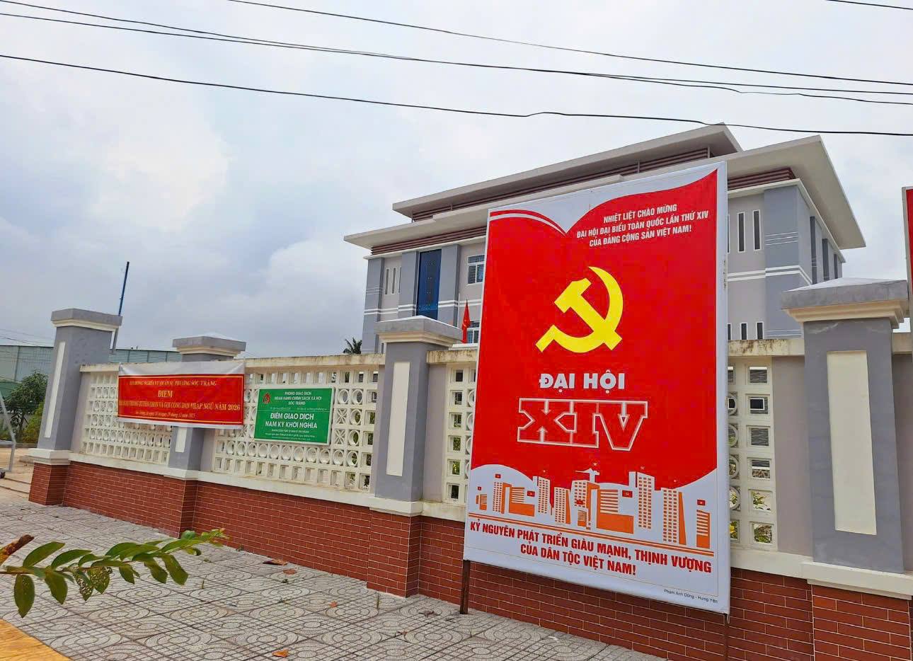 Phường Sóc Trăng 'khoác lên mình' sắc đỏ - vàng nổi bật, với cờ Đảng, cờ Tổ quốc, pano, băng rôn khẩu hiệu chào mừng Đại hội Đảng